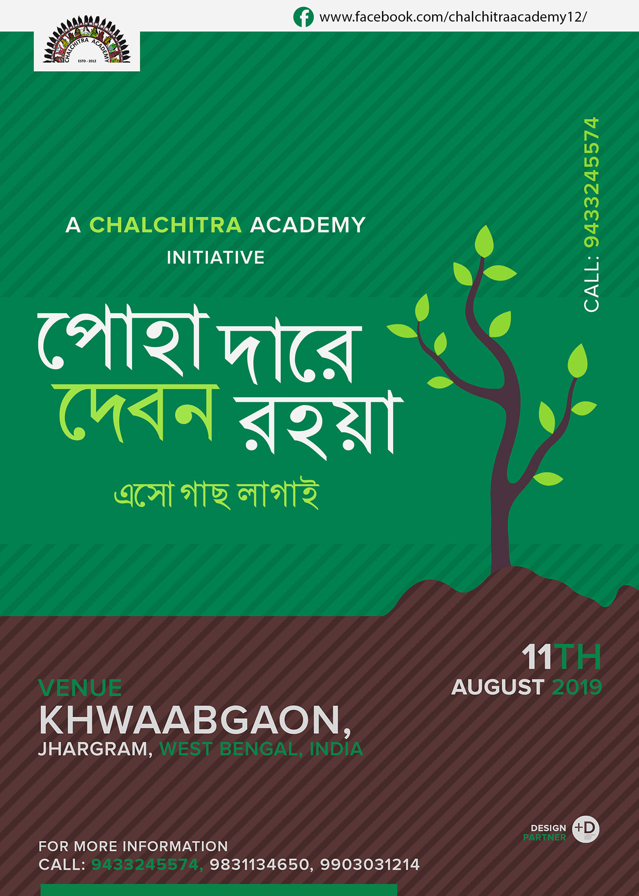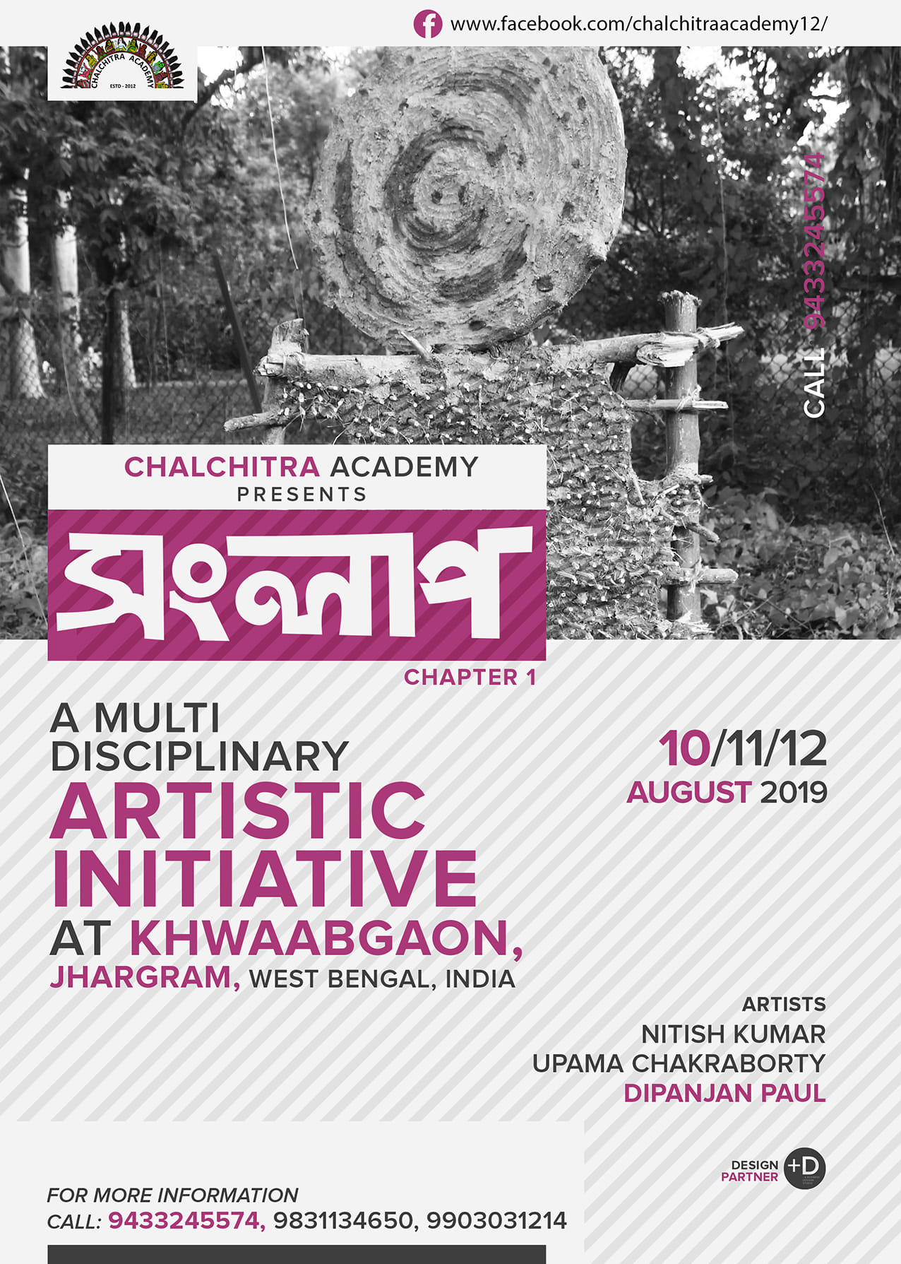 Sanglap – Chapter I. Dates: 10th, 11th, & 12th August 2019: The inaugural chapter of Sanglap witnessed three young art graduates of Kala Bhavana, Santiniketan volunteering in the public art project. Upama Chakraborty’s work ‘Lalbazaar to Barabazaar’ transported urban images and cacophony to the village space, interrogating facets of modernity and urbanity. Dipanjan Pal made several environmental sculptures with active participation of the community, and Nitish Kumar came up with a site specific sound installation, using nearly hundred collected and used steel glasses, creating an interactive space, where the work blurred the boundaries between the sacred and the profane. Nitish also engaged with a series of performances. A tree plantation ceremony was also held on 11th August, where the entire village folk planted a sapling each.Chalchitra Academy took the initiative of planting trees under an event titled as “Poha daare debon rohoya: Esho gachh lagay”. Here each and every villager, regardless of their age or gender, planted a tree each and adopted the said saplings as their own children with the promise of looking after them forever. For Chalchitra Academy’s spearhead, artist Mrinal Mandal, himself a native of Jhargram, nature has been a lifelong source of inspiration, devotion, and magic. Thus, for each of the 75 inhabitants there was a living promise and pledge of 75 newly planted Shaal and Palash saplings.