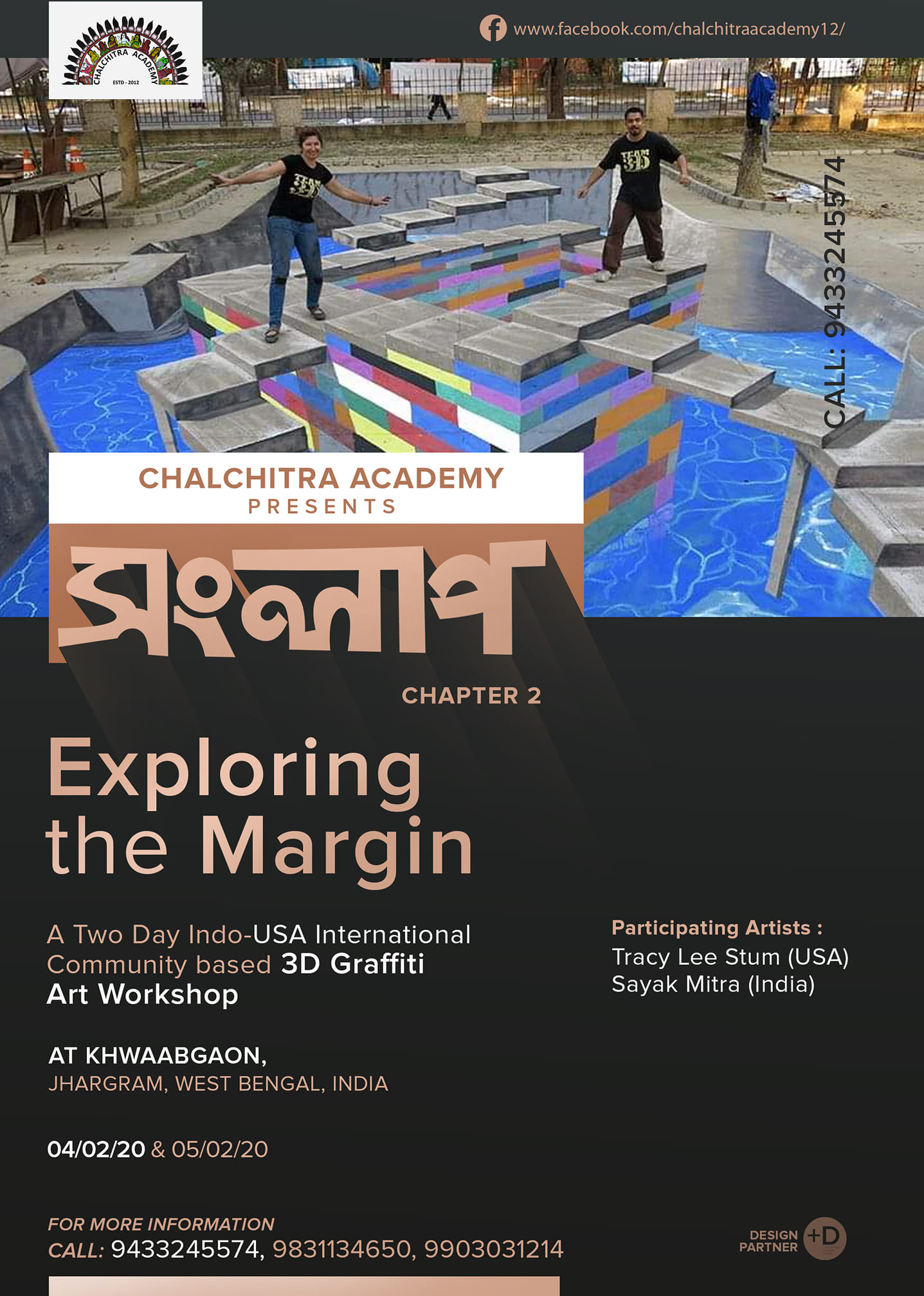 Sanglap – Chapter II. Dates: 4th and 5th February 2020 : The second version of Sanglap was titled ‘Exploring the Margin’ where a two day community based 3D graffiti art workshop was conducted by renowned American graffiti artist Tracy Lee Stum and New Jersey based Indian artist Sayak Mitra. The artists recreated a 3D fish tank with the help of the young participants of the village. The joy of interacting with a 3D illusionistic painting was priceless.