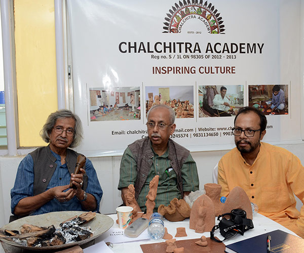 At around 1500 CE, the shellac art form entered Bengal from western regions of India with the encouragement of the Mughal general Raja Man Singh. The artisans of Bengal started by covering terracotta bangles with shellac. Later, the art form shifted to covering-up terracotta dolls with a layer of shellac. Shellac terracotta dolls, in their general shape, are similar to the ‘Mother God’ sculpture found in the Harappan and other chalcolithic ruins. The next stage was shellac painting on terracotta figurines in the form of animal figurines which were often used as votive objects. The mud from termite nests is used for terracotta statues. The clay models are then dried in shade and fired in a furnace. Shellac sticks are made from adding organic colours to raw shellac. These are then used to decorate the burnt clay models in bright vibrant colours. Laksha-Deep, a workshop organised by Chalchitra Acadey took place on 13th and 14th of June, 2015. The guide for this event was the senior shellac artist and master craftsman – Sri Brindaban Chanda from the village of Paschim Shai , district of East Midnapore. Asst. Prof. Saurav Jana of the Burdwan College of Art & Design further engaged the participants by sharing a slide show on the gradual evolution of dolls in India vis-a-vis various socio-cultural stages. An interactive session followed this lecture where the special guest, Prof. Manoj Sarkar, Reg. Sec. Of Kolkata’s Lalit Kala Akademi, along with various artists and amateurs took part.